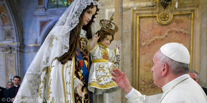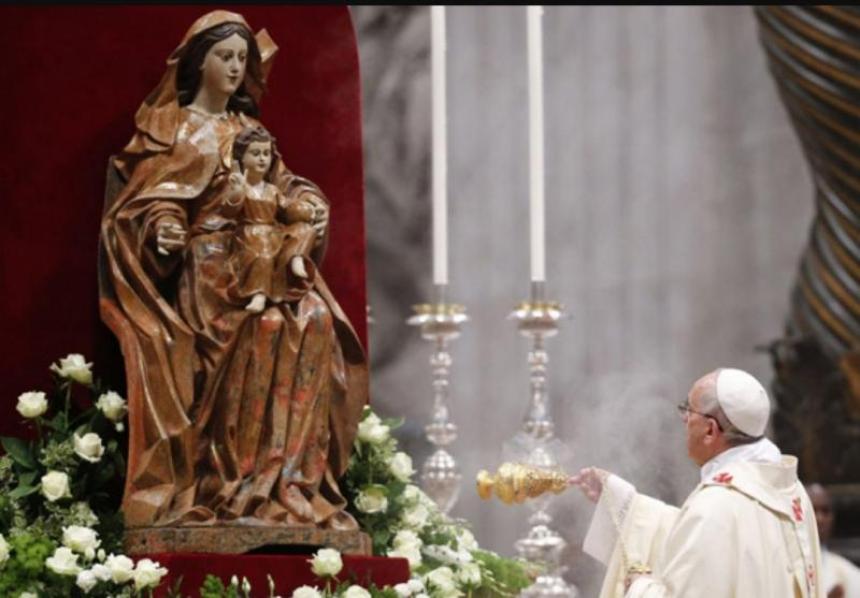 Påven sprider rökelse framför en staty av Maria och Jesusbarnet.
